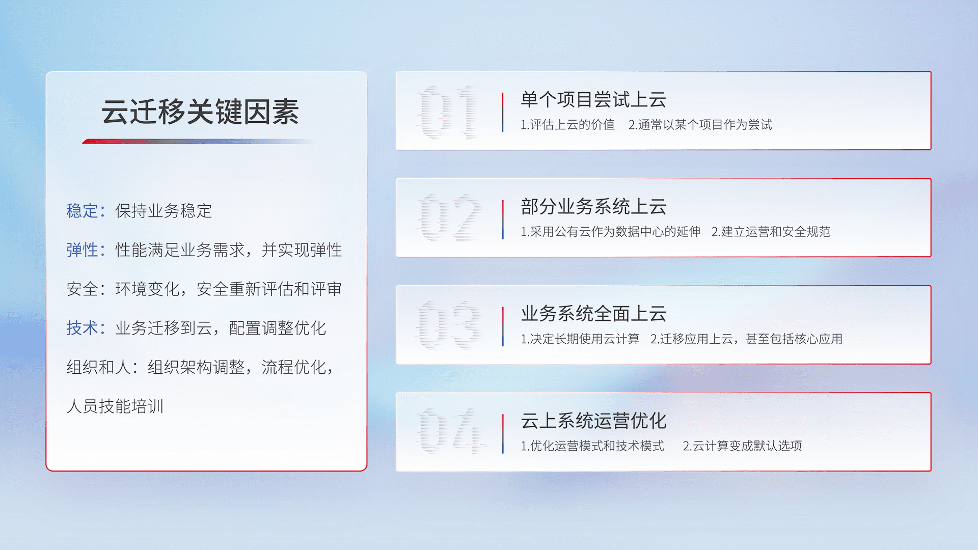 结合实际业务,,,从规划设计、、、、云平台选型、、、、云原生改造、、、数据迁移、、集成交付,,,迁移全过程为客户识别最佳上云路径,,,,做好风险识别管理,,,设计网络架构、、、身份权限、、、安全审计合规、、、操作审计、、日志审计、、、监控告警策略、、多站点容灾设计等,,对云上基础设施进行整体规划,,,,提升IT治理水平,,以满足弹性、、、、高可用、、、高性能的需求。。。